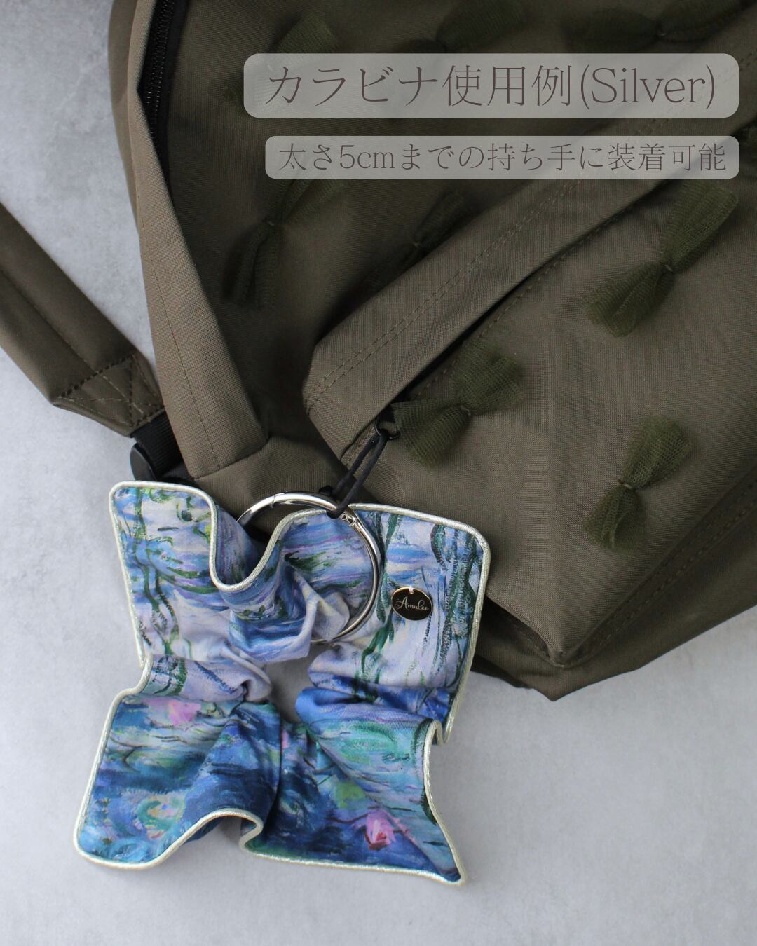 シュシュをバッグなどにつけられるカラビナ金具を+120円でご購入可能。