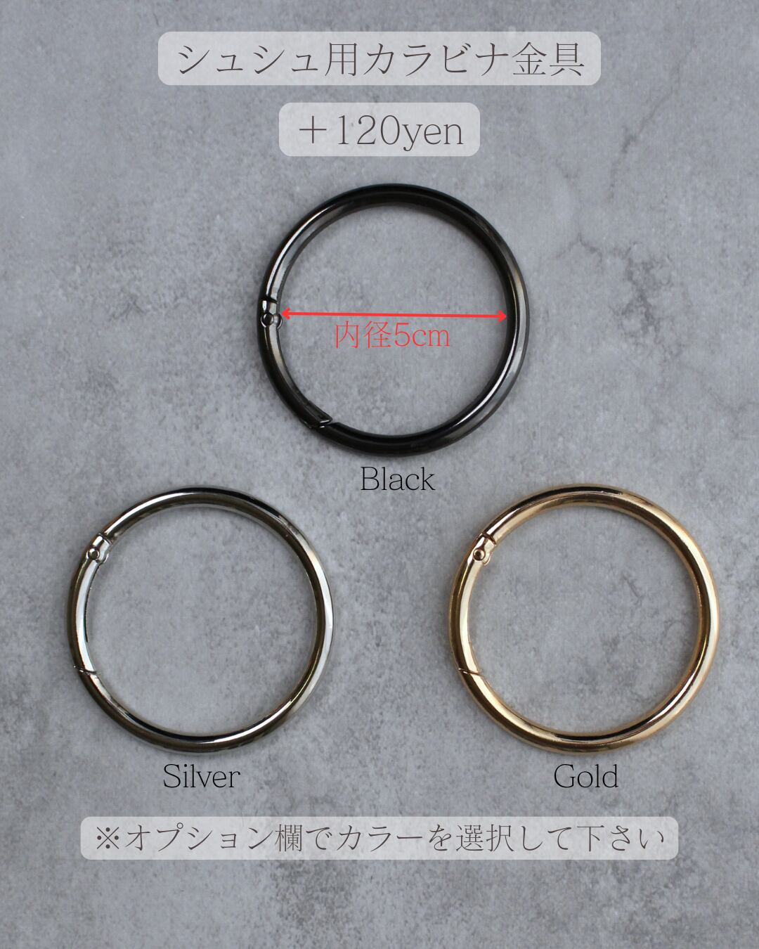 シュシュをバッグなどにつけられるカラビナ金具を+120円でご購入可能。