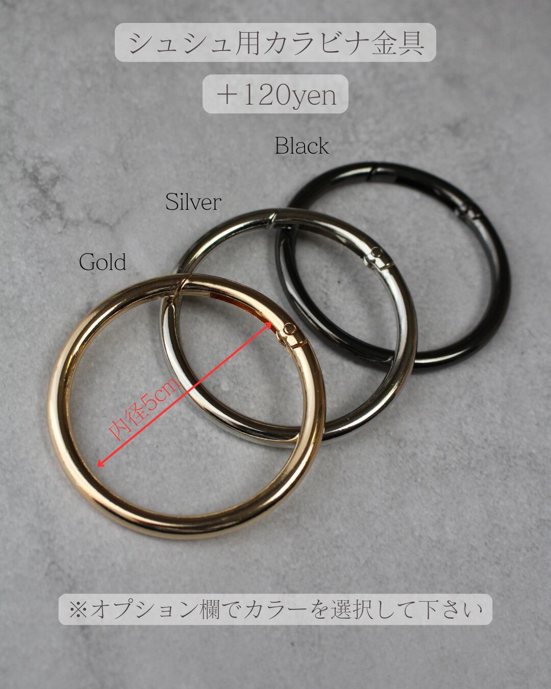 シュシュをバッグなどにつけられるカラビナ金具を+120円でご購入可能。
