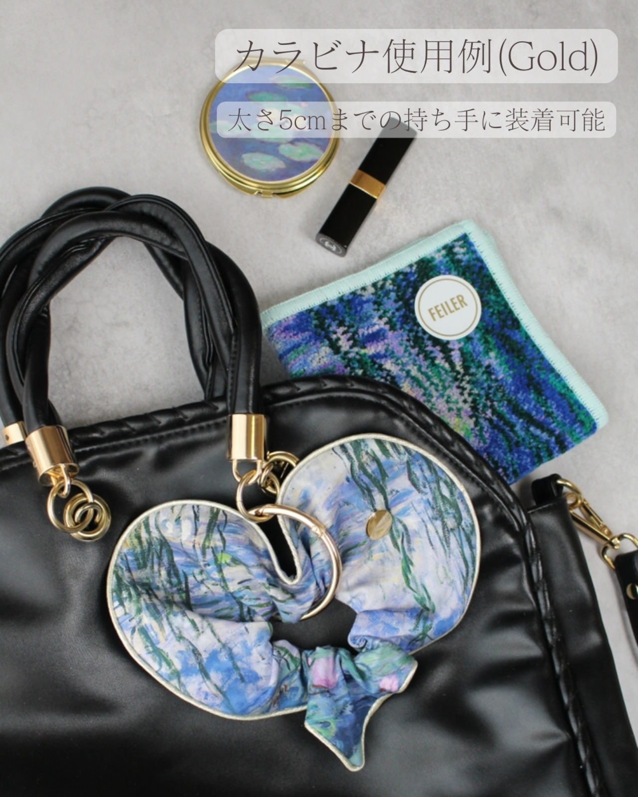 シュシュをバッグなどにつけられるカラビナ金具を+120円でご購入可能。