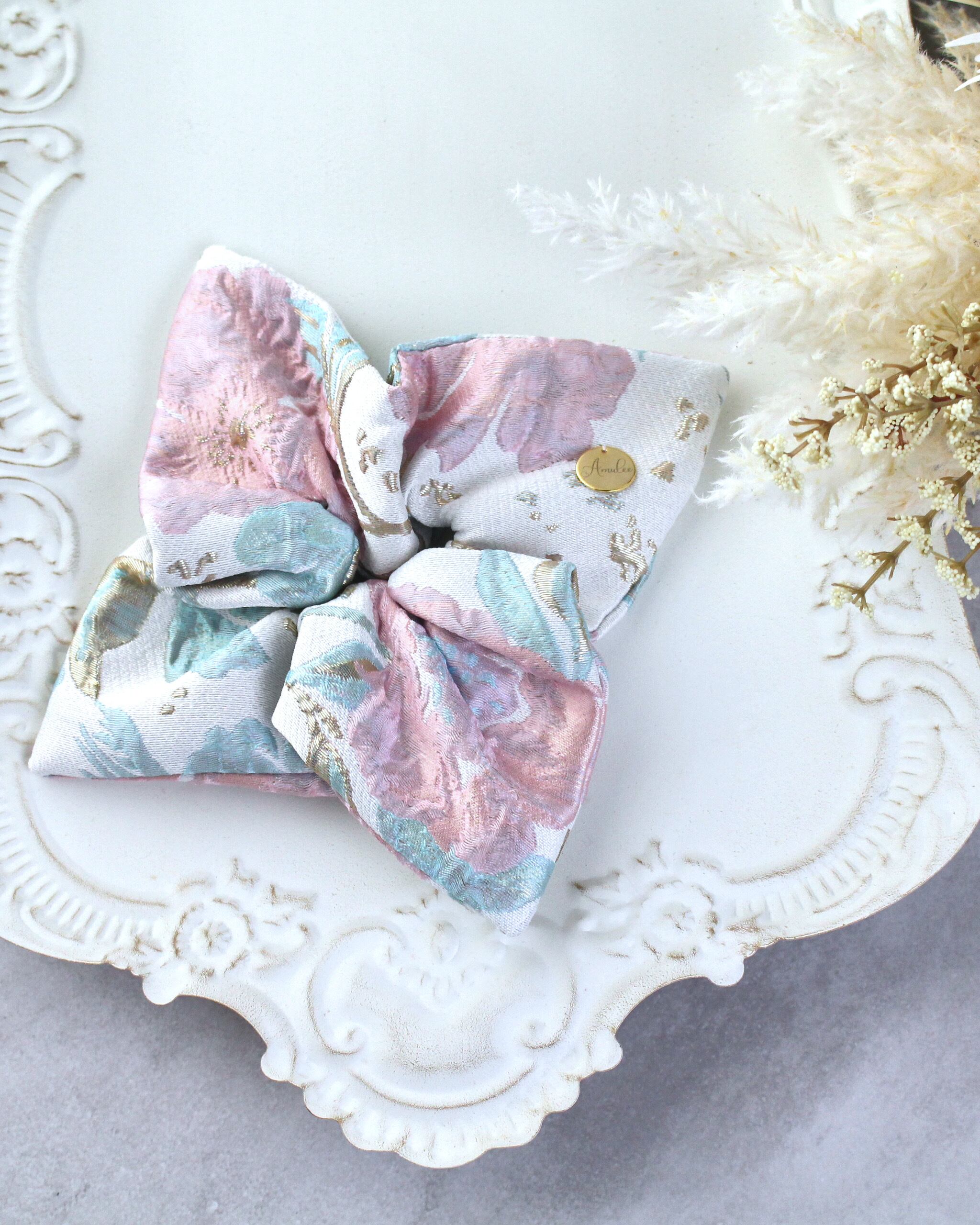 スクエアシュシュ/白地×ピンクとグリーンのBIGフラワー